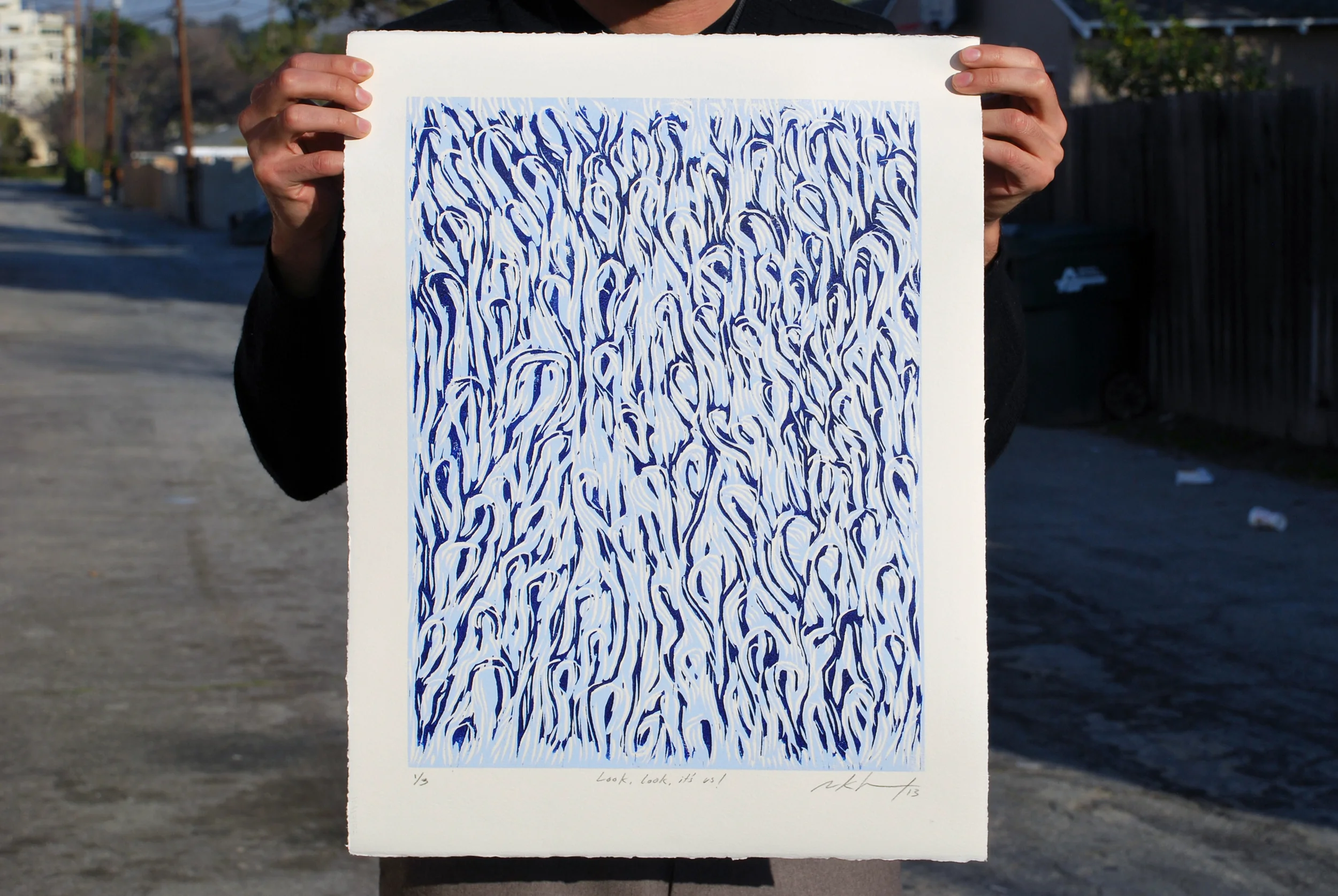 Woodcut. Image handcarved on cherry wood and printed on BFK printmaking paper. 3 Editions total. 2013. SOLD OUT